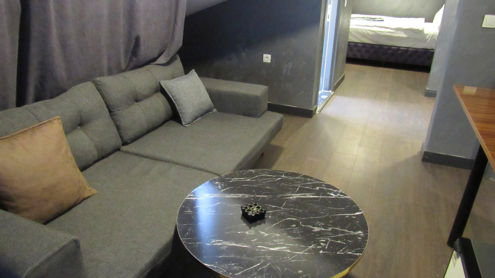 Dairemiz, 1+1 olup. Dairede 1 adet yatak odası, 1 adet banyo, 1 adet salon bulunmaktadır. Yatak odasında çift kişilik bir yatak, balkonda jakuzi, salonda ise oturma grubu, televizyon, klima ve uydu yayını mevcuttur.